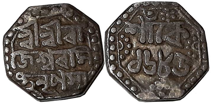 Rajesvara Simha, Silver Rupee, 11.17g, SE1674, Assamese legend on both sides within dotted border, Obv: “Sri Sri Hara/Gauri Charana Ka/mala Makaranda/ Madhukarasya”, Rev: “Sri Sri Svarga/ Deva Sri Rajesva/ra Simha Nrpasya/Sake 1674”, Lion to left (R&B# O36.1). Very fine.