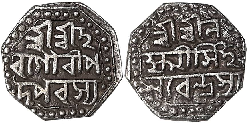 Lakshmi Simha, Silver Rupee, 11.31g, SE1693, Assamese legend on both sides within dotted border, Obv: “Sri Sri Hara/ Gauri Charana ra/vinda Makaranda/ Madhukarasya”, Arc of dots upper left and bottom center, Rev: “Sri Sri Svarga/ Deva Sri Laksmi/ Simha Nrpasya/ Sake 1693”, Lion to right (R&B# Q26.3). Very fine+.