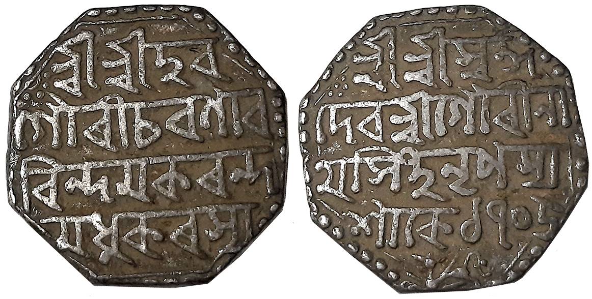 Lakshmi Simha, Silver 1/2 Rupee (2), 5.67g, 5.70g Assamese legend on both sides within dotted border, Obv: “Sri Sri Ha/ra Gauri Pa/da Parasya”, Rev: “Sri Sri La/ksmi Simha Na/rendrasya” (R&B# Q36.1).Very fine. 2 coins.