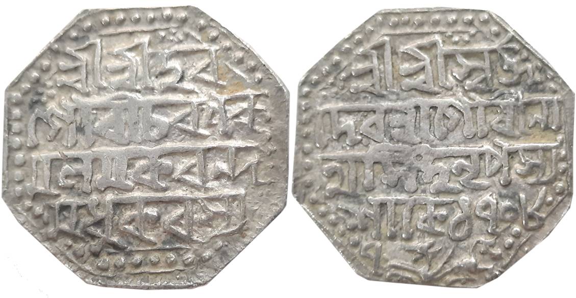Silver (2), Lakshmi Simha, 1/4 Rupee, 2.52g, & Gaurinath Simha, 1/32 Rupee, 0.63g, Assamese legend on both sides within dotted border. Very fine. 2 coins.