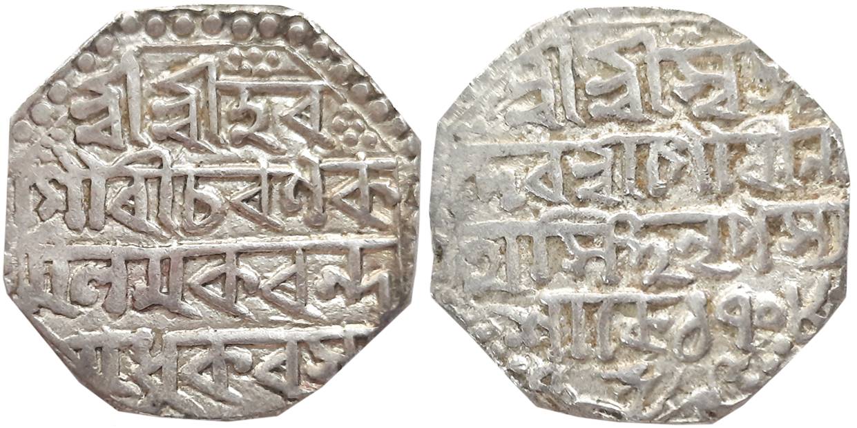 Gaurinatha Simha, Silver Rupee, 11.24g, SE1703, Assamese legend on both sides within dotted border, Obv: “Sri Sri Hara/ Gauri Charana ra/vinda Makaranda/ Madhukarasya”, Rev: “Sri Sri Svarga/ Deva Gaurina/tha Simha Nrpasya/ Sake 1703”, Lion to right (R&B# R50.1). Very fine.