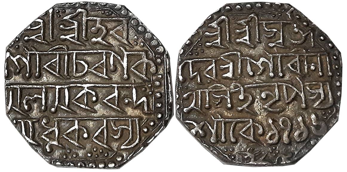 Gaurinatha Simha, Silver Rupee, 11.39g, SE1708/ 7, Assamese legend on both sides within dotted border, Obv: “Sri Sri Hara/ Gauri Charana Ka/mala Makaranda/ Madhukarasya”, Rev: “Sri Sri Svarga/ Deva Gaurina/tha Simha Nrpasya/ Sake 1708/ 7” Lion to left (R&B# R40.1). Very fine.