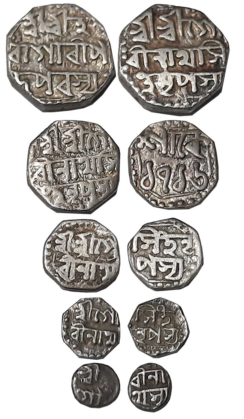 Gaurinatha Simha, Silver Rupee, 11.39g, SE1716, Assamese legend on both sides within dotted border, Obv: “Sri Sri Hara/ Gauri Charana Ka/mala Makaranda/ Madhukarasya”, Rev: “Sri Sri Svarga/ Deva Gaurina/tha Simha Nrpasya/ Sake 1716”, Lion to left (R&B# R50.1). Very fine.