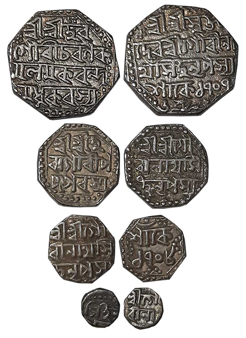 Gaurinatha Simha, Silver Rupee, 11.39g, SE1716, Assamese legend on both sides within dotted border, Obv: “Sri Sri Hara/ Gauri Charana Ka/mala Makaranda/ Madhukarasya”, Rev: “Sri Sri Svarga/ Deva Gaurina/tha Simha Nrpasya/ Sake 1716”, Lion to left (R&B# R50.1). Very fine.