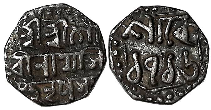Gaurinatha Simha, Silver 1/2 Rupee, 5.67g, Assamese legend on both sides within dotted border, Obv: “Sri Sri Ha/ra Gauri Pa/da Parasya”, Rev: “Sri Sri Gau/rinatha Simha/ Nrpasya” (R&B# R64.1). Very fine
