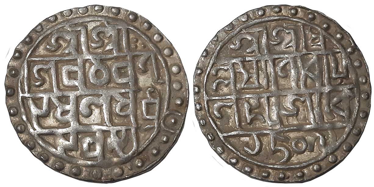 Nara Narayan, Silver Tanka, 10.51g, SE1477, Bengali legend in 4 lines (KM# 35). Very fine.