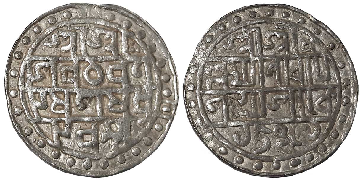 Lakshmi Narayan, Silver Tanka, 10.27g, SE1509/ CB-98, Obv: Bengali legend "Sri Sri/Siva Charana/Kamala Madhu/Karasya" within double circle with border of dots, Rev: Bengali legend "Sri Srima/n Lakshmi Naraya/Nasya sake/1509" within circle and border of dots (KM# 44). Very fine.