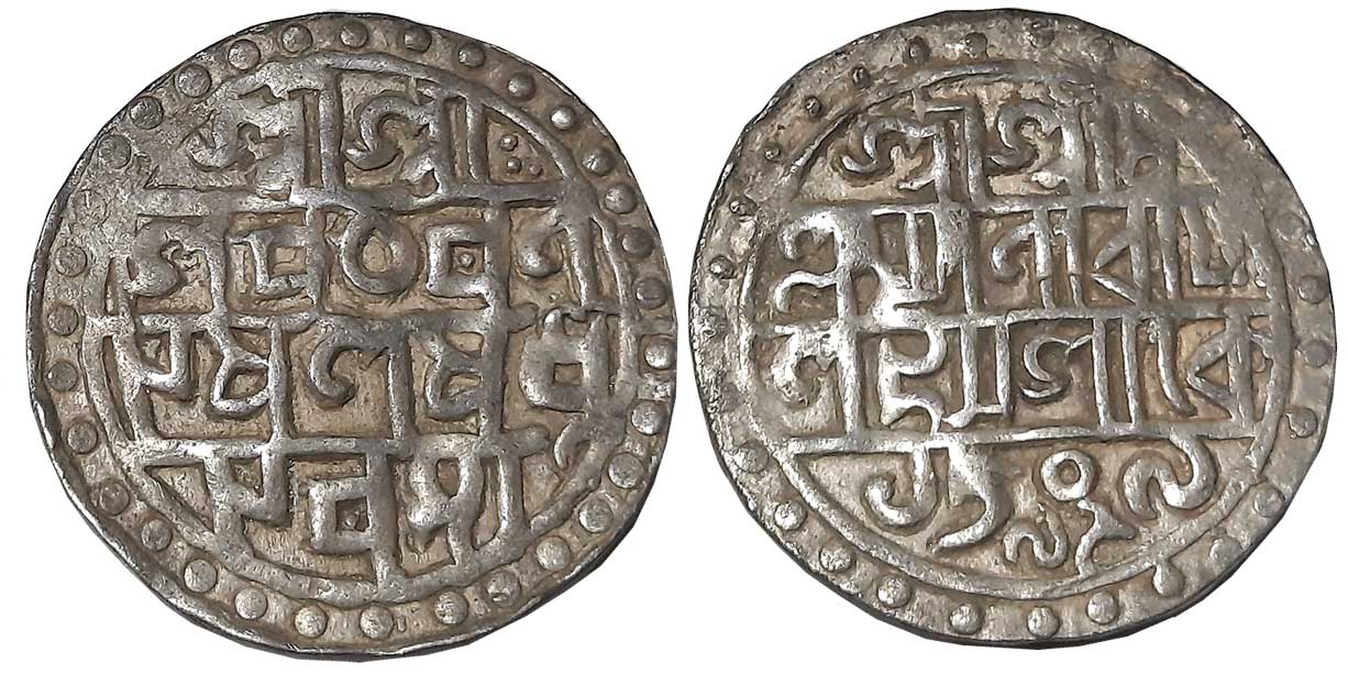 Lakshmi Narayan, Silver Tanka, 10.05g, SE1509/ CB-98, Obv: Bengali legend "Sri Sri/Siva Charana/Kamala Madhu/Karasya" within double circle with border of dots, Rev: Bengali legend "Sri Srima/n Lakshmi Naraya/Nasya sake/1509" within circle and border of dots (KM# 44). Very fine.