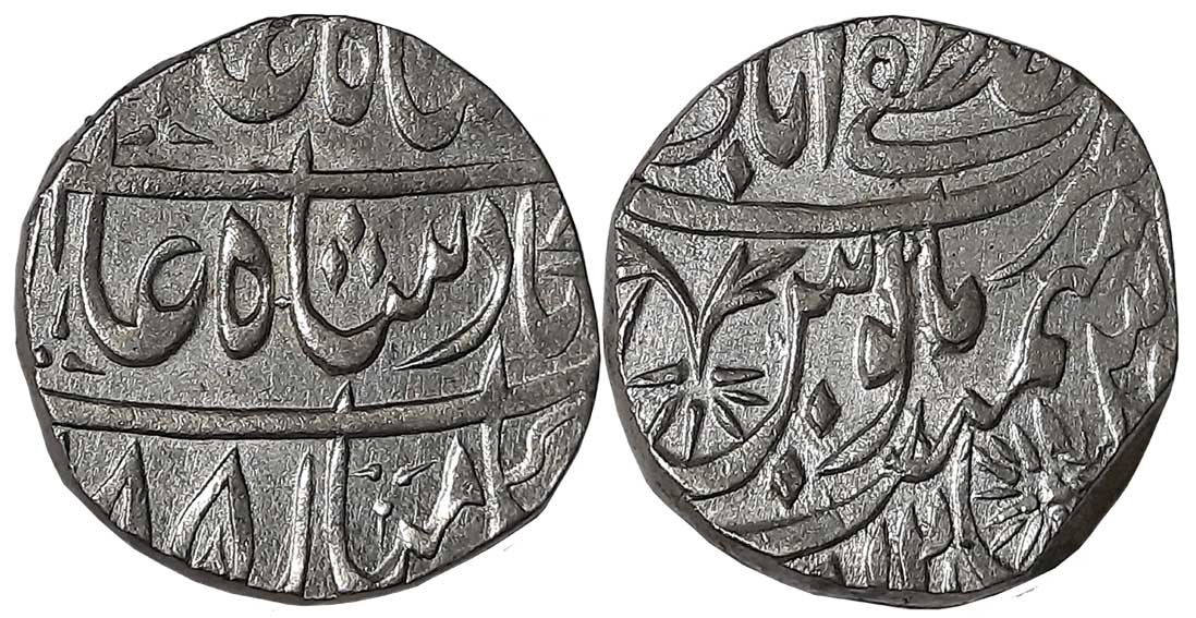 Faizullah Khan, Silver Rupee, 11.12g, Muhammadnagar Tanda Mint, in the name of Shah Alam II, AH 1186/ RY 12, Flag to left. Complete Mint name on top of reverses. Very fine+, scarce.