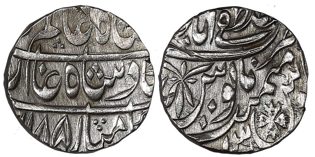 Faizullah Khan, Silver Rupee, 11.12g, Muhammadnagar Tanda Mint, in the name of Shah Alam II, AH 1186/ RY 12, Flag to left. Complete Mint name on top of reverses. Very fine+, scarce.