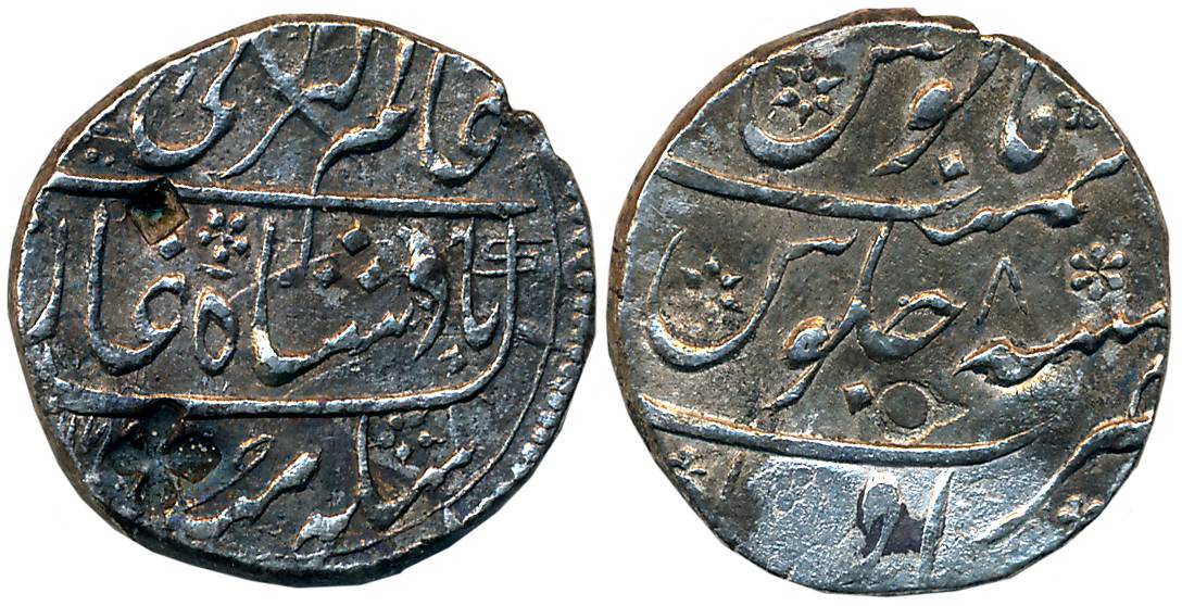 Farrukhsiyar, Silver Rupee, 11.38g, Broad flan, Gwalior Mint, AH 1129/ RY 6 (KM# 377.30). Complete legend on both sides. About uncirculated.