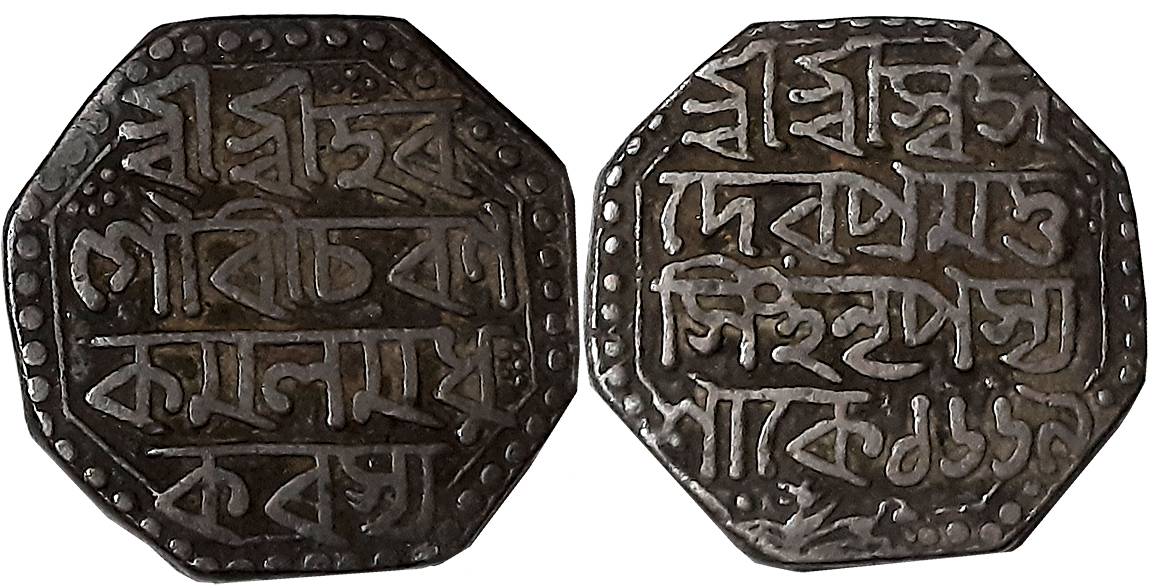 Siva Simha with Queen Pramathesvari, Silver Rupee, 11.34g, SE1653, Assamese legend on both sides within dotted border, Obv: “Sri Sri Hara/ Gauri Pada Pa/rayanayah/ Sake 1653”, Lion to right, Rev: “Sri Sri Siva/ Simha Nrpa Mahi/si Sri Pramathesv/ri Devyah” (R&B# I10.1). About extremely fine.
