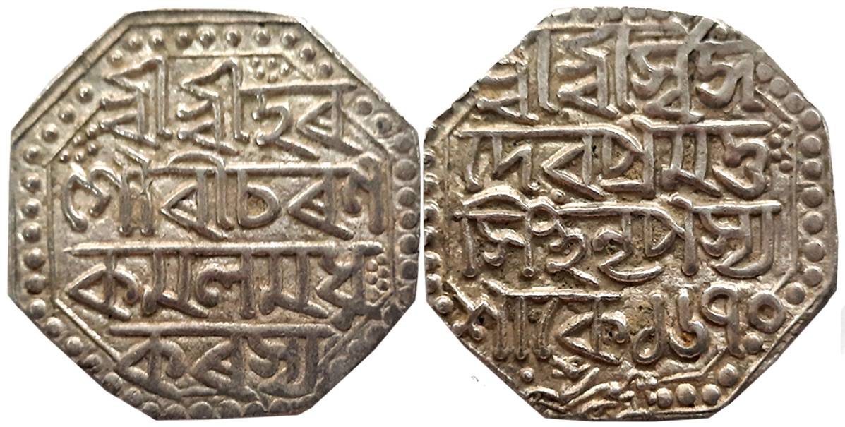 Siva Simha with Queen Ambika, Silver 1/2 Rupee, 5.65g, Assamese legend on both sides within dotted border, Obv: “Sri Sri Si/va Simha Na/resvara”, Rev: “Tadvalla/bha Srimad Ambi/ka Devinam/ 19”. Very fine.