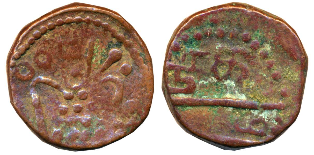 Swati Thirunal Rama Varma, Copper Cash, 0.52g, Obv: Shivlinga, Numeral 1055 below, Rev: Conch- Shankh (B Sarasan# 197.1-2). About extremely fine, rare.