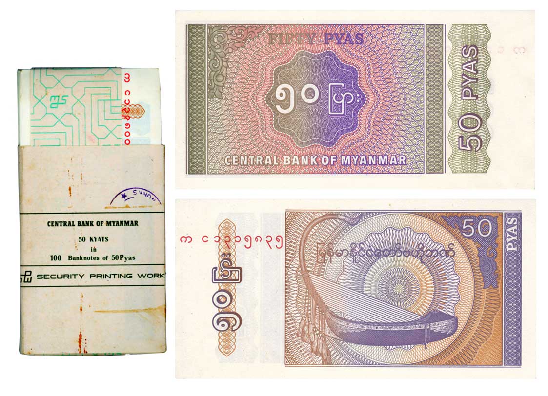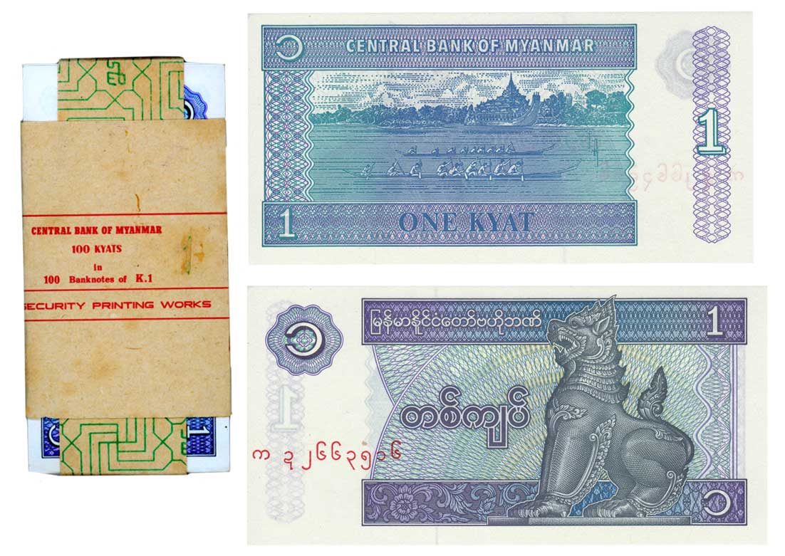 Myanmar, Kyat 5, Pack of 100 Notes, Obv: Brown and blue Chin the at left, Rev: Chinlone cane ball game (Pick# 70). Uncirculated, Pack of 100 Notes with original interlock paper cover.