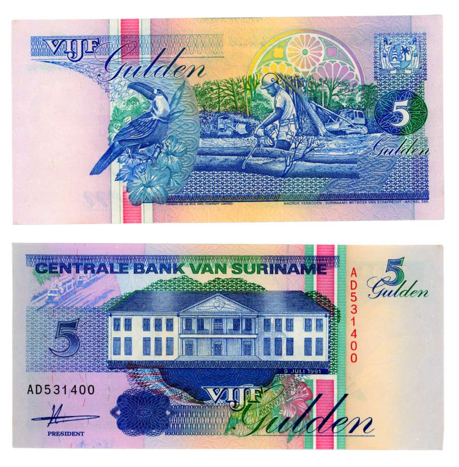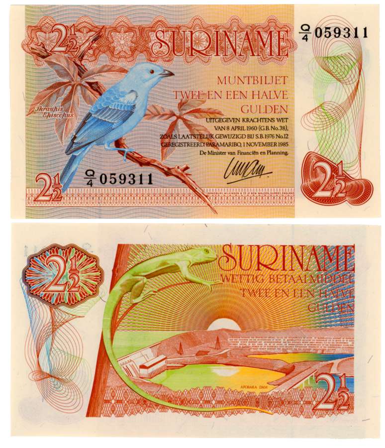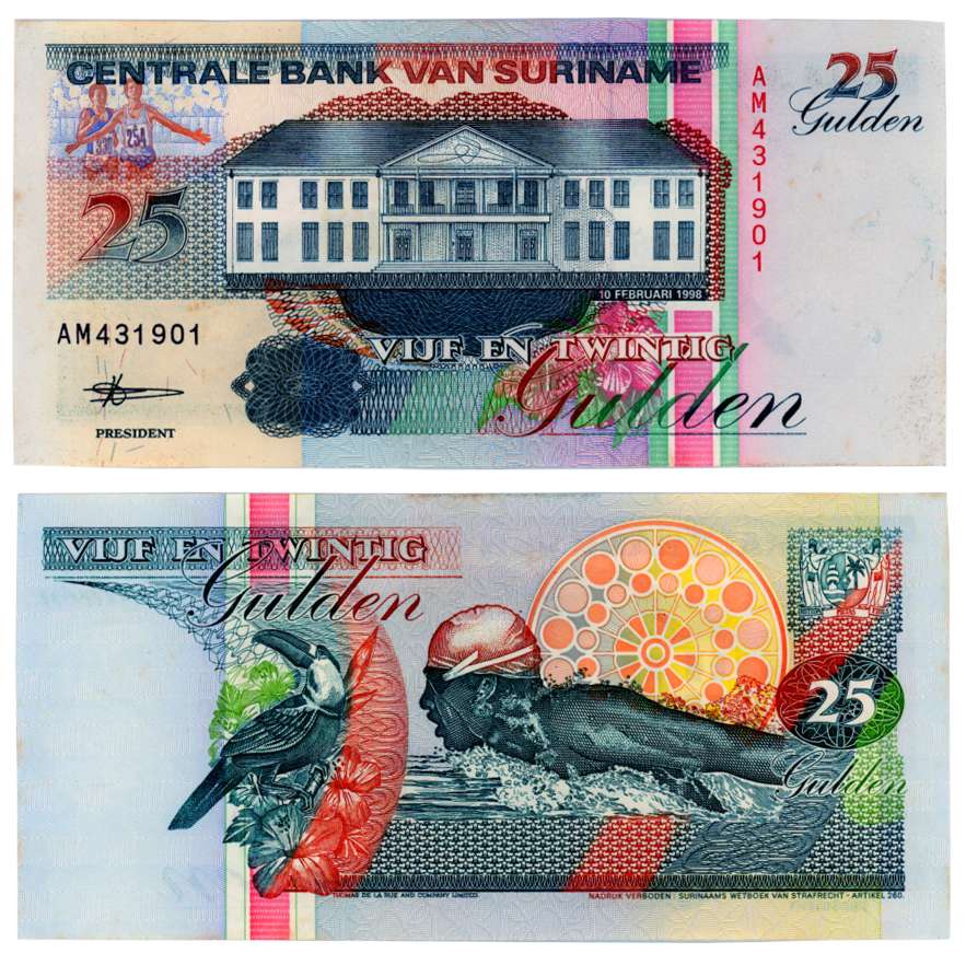 Suriname, Gulden 25, Pack of 100 Notes, Obv: Portrait of Anton DeKom, Rev: Illustration of Toucan, Illustration of people and speaker (Pick# 132). Uncirculated, Pack of 100 Notes.