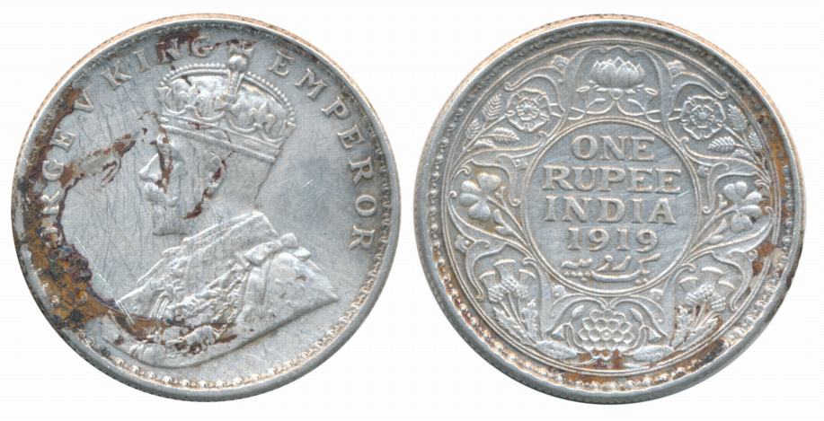 George V, Silver Rupee, 1919, Obv: King George V facing to left, Rev: Denomination & Date within circle, wreath surrounds, Very fine. Uncleaned. Certified, Authenticated and packed in Temper Proof Coin Card.