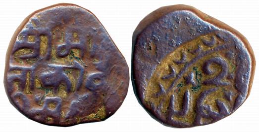 Post Mauryan, Ujjain region, Copper, 2.88g, Obv: Humped Bull walking to right in front of tree in railing, Bull, triangular headed standard flanked by taurine above, Rev: Four orb Ujjaini symbol (worn out). Fine.