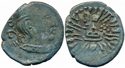 Satvahanas, Gautamiputra Siri Satakarani, Potin, 2.50g, “Universal- Elephant” type, Obv: Elephant standing with upraised trunk to right, Brahmi legend “(Rno) Siri Satakarani” around, Rev: Ujjain symbol (Piper# 2737). Extremely fine.