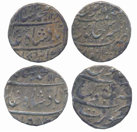Muhammad Shah, Silver Rupees (2), 11.46g, 11.54g, Itawa Mint, AH 1149/ RY 19 & Surat Mint, RY 4 (KM# 436.29, 436.60). 2 coins.