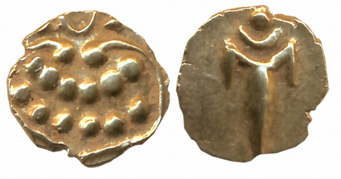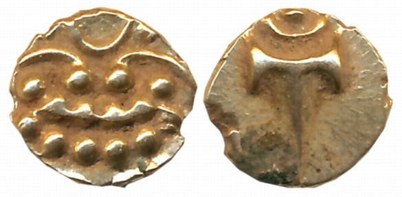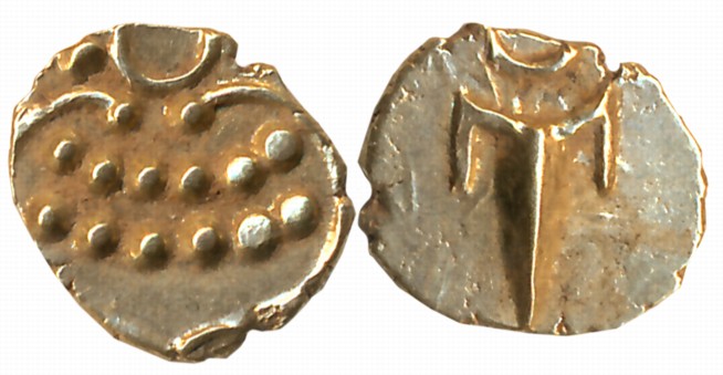 Tanjore Marathas, Venkoji, Gold Fanam, 0.37g, Obv: Stylised Lion with pellets, Rev: Dagger (K Ganesh# 10.1). Extremely fine+.