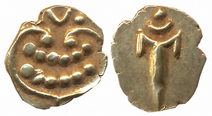 Tanjore Marathas, Venkoji, Gold Fanam, 0.36g, Obv: Stylised Lion with pellets, Rev: Dagger (K Ganesh# 10.1). Extremely fine+.