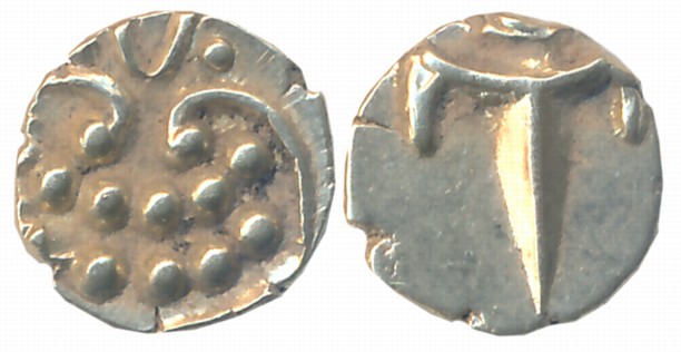 Tanjore Marathas, Venkoji, Gold Fanam, 0.38g, Obv: Stylised Lion with pellets, Rev: Dagger (K Ganesh# 10.1). Extremely fine+.
