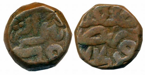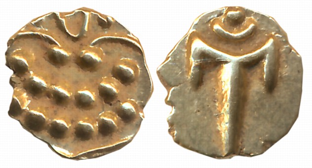 Tanjore Marathas, Venkoji, Gold Fanam, 0.37g, Obv: Stylised Lion with pellets, Rev: Dagger (K Ganesh# 10.1). Extremely fine+.
