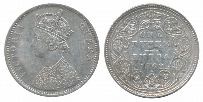 Victoria Queen, Silver Rupees, 1862, Obv: Crowned Bust of Victoria facing left, Rev: Legend “ONE RUPEE INDIA” date with in wreath. Very fine.Certified, Authenticated and packed in Temper Proof Coin Card. You are saving Rs. 100/- on this purchase.