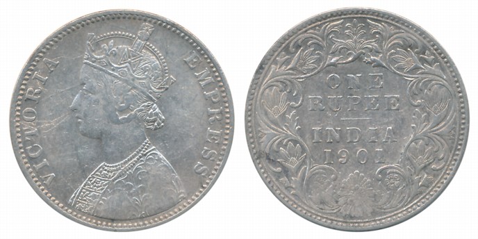 Victoria Empress, Silver Rupee, 1901, Obv: Crowned Bust of Victoria facing left, Legend “VICTORIA EMPRESS”, Rev: Legend “ONE RUPEE INDIA” date with in wreath. Very fine. Certified, Authenticated and packed in Temper Proof Coin Card. You are saving Rs. 100/- on this purchase.
