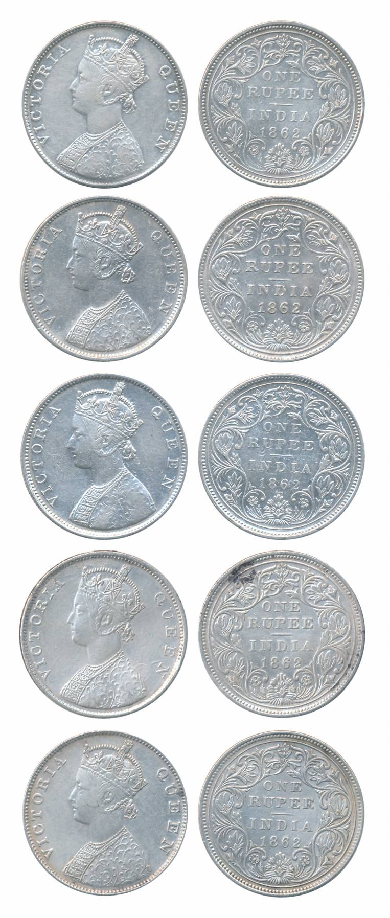 Victoria Queen, Silver Rupees (5), 1862, Obv: Crowned Bust of Victoria facing left, Rev: Legend “ONE RUPEE INDIA” date with in wreath. Very fine. Pack of 5 Coins. This are original coins of British India struck during reign of Victoria Queen, Nice for Numismatic collection or for pooja purpose or for gift. All coins packed in Temper proof slab with life time guarantee of authenticity “CERTIFIED GENUINE COIN”. You are saving Rs. 750/- on this purchase.