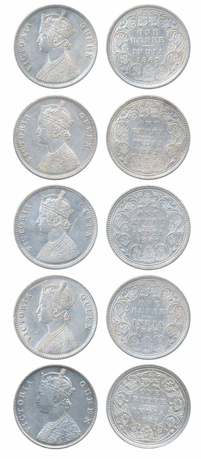 Victoria Empress, Silver Rupees (5), 1862, Obv: Crowned Bust of Victoria Empress facing left, Legend “VICTORIA EMPRESS”, Rev: Legend “ONE RUPEE INDIA” date with in wreath. Very fine. Pack of 5 Coins. This are original coins of British India struck during reign of Victoria Empress, Nice for Numismatic collection or for pooja purpose or for gift. You are saving Rs. 750/- on this purchase.