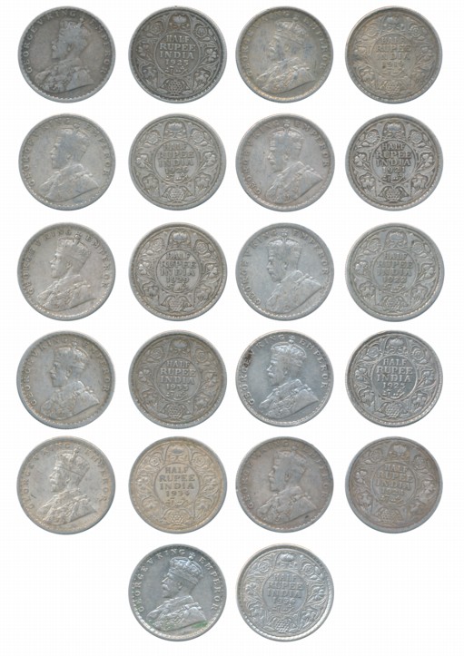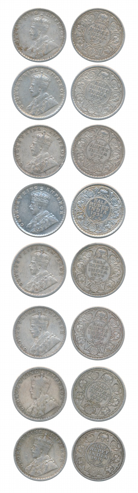George V, Silver 1/2 Rupees (4), 1926, 1933, 1934, 1936. Very Fine. 4 coins. You are saving Rs.200/- on this purchase.