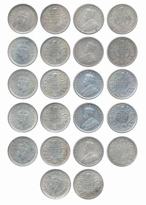 George V, Silver 1/2 Rupees (6), 1921, 1925, 1926, 1933, 1934, 1936. Very Fine. 6 coins. You are saving Rs.300/- on this purchase.