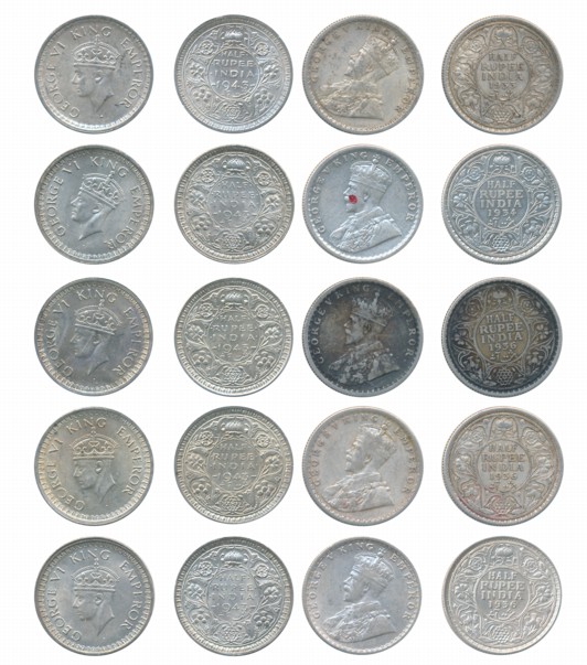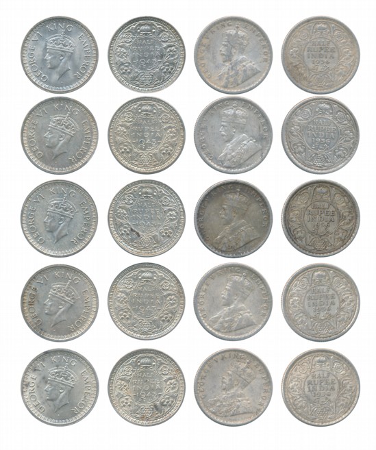 George V, Silver 1/2 Rupees (11), 1919, 1921, 1922, 1923, 1924, 1925, 1926, 1929, 1933, 1934, 1936. Very Fine. 11 Coins. You are saving Rs.500/- on this purchase.