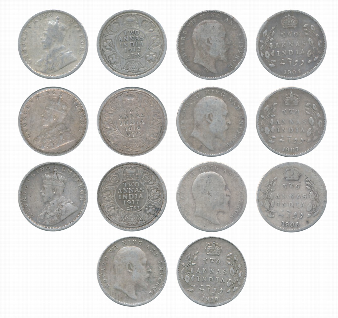 Silver 2 Anna (11), Edward, 1904, 1905, 1906, 1907, 1908, 1910 & George V, 1912, 1913, 1914, 1916, 1917. Very Fine. 11 coins. You are saving Rs.550/- on this purchase.