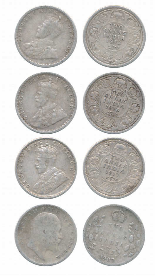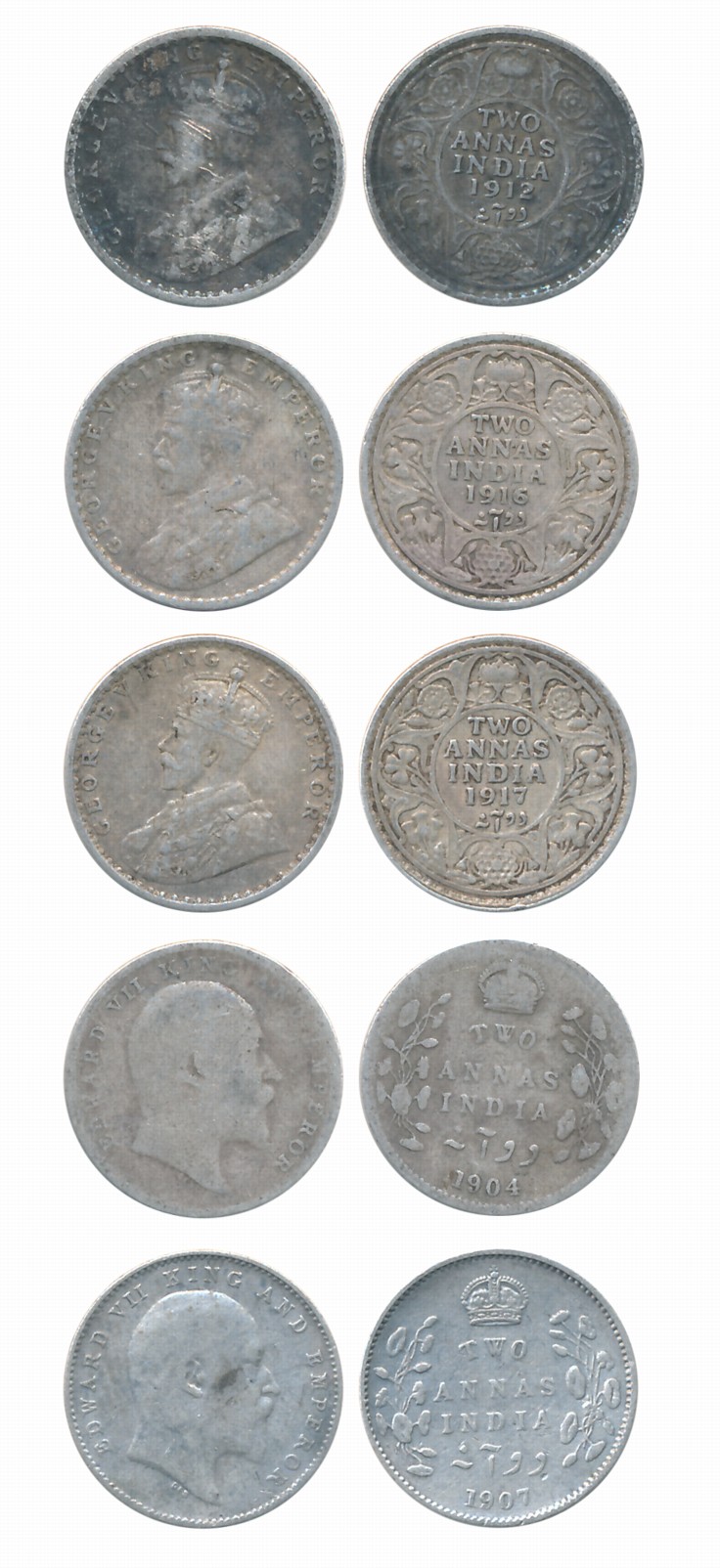 Silver 2 Anna (9), Edward, 1904, 1905, 1906, 1907, 1910 & George V, 1912, 1913, 1916, 1917. Very Fine. 9 coins. You are saving Rs.450/- on this purchase.