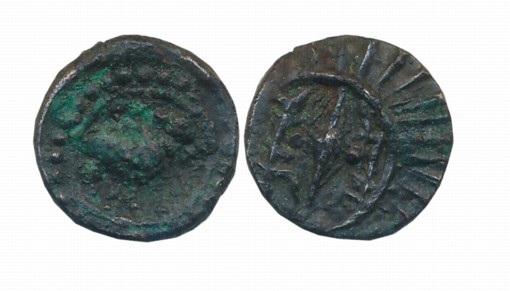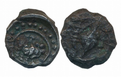 Vishnukundin, Andhra Region, Copper Base Alloy, 3.07g, Obv: Lion facing right front Srivatsa, Rev: Conch shell between two tridents. Very fine to very fine+.