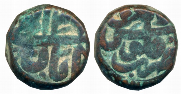Vishnukundin, Andhra Region, Copper Base Alloy, 3.08g, Obv: Lion facing right front Srivatsa, Rev: Conch shell between two tridents. Very fine to very fine+.
