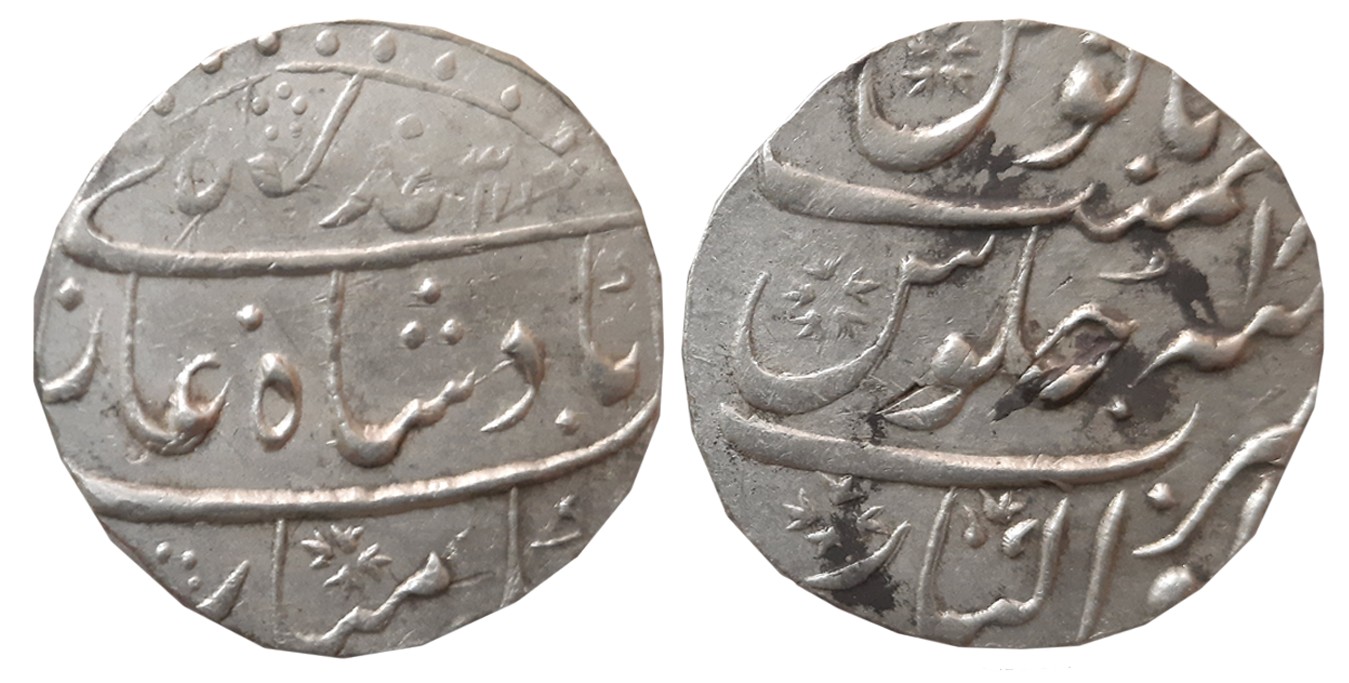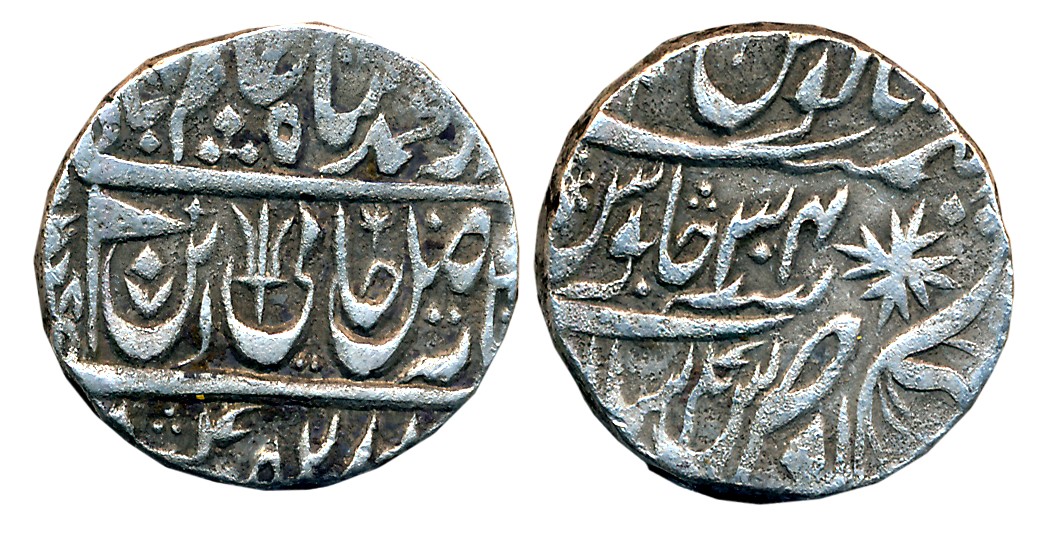 Silver Rupee,10.57g, in the name of Muhammad Akbar II, Isagarh Mint, Cannon and Battle axe as mint mark (KM# 86). Very fine.