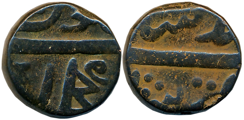 Indore, Ahalya Bai, Copper 1/2 Anna, 12.47g, AH 1202, in the name of Shah Alam II, Obv: Fly whisk and Trident, Rev: Legend & date (KM# A54). Extremely fine for type.