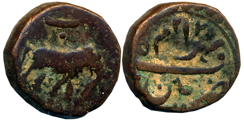 Tipu Sultan, Copper Paisa, 9.94g, Farrukhyab Hisar Mint, Elephant to left (KM# 63.1). Uncleaned, fine+.
