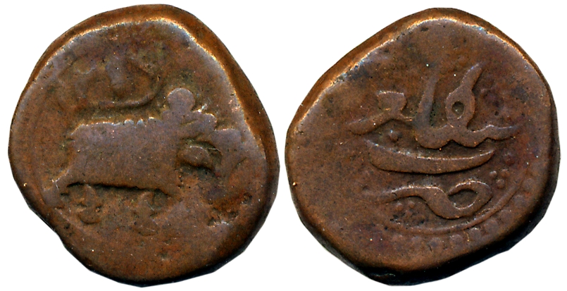 Tipu Sultan, Copper Paisa, 11.11g, Nagar Mint, Elephant to left (KM# 103.10). Fine+.