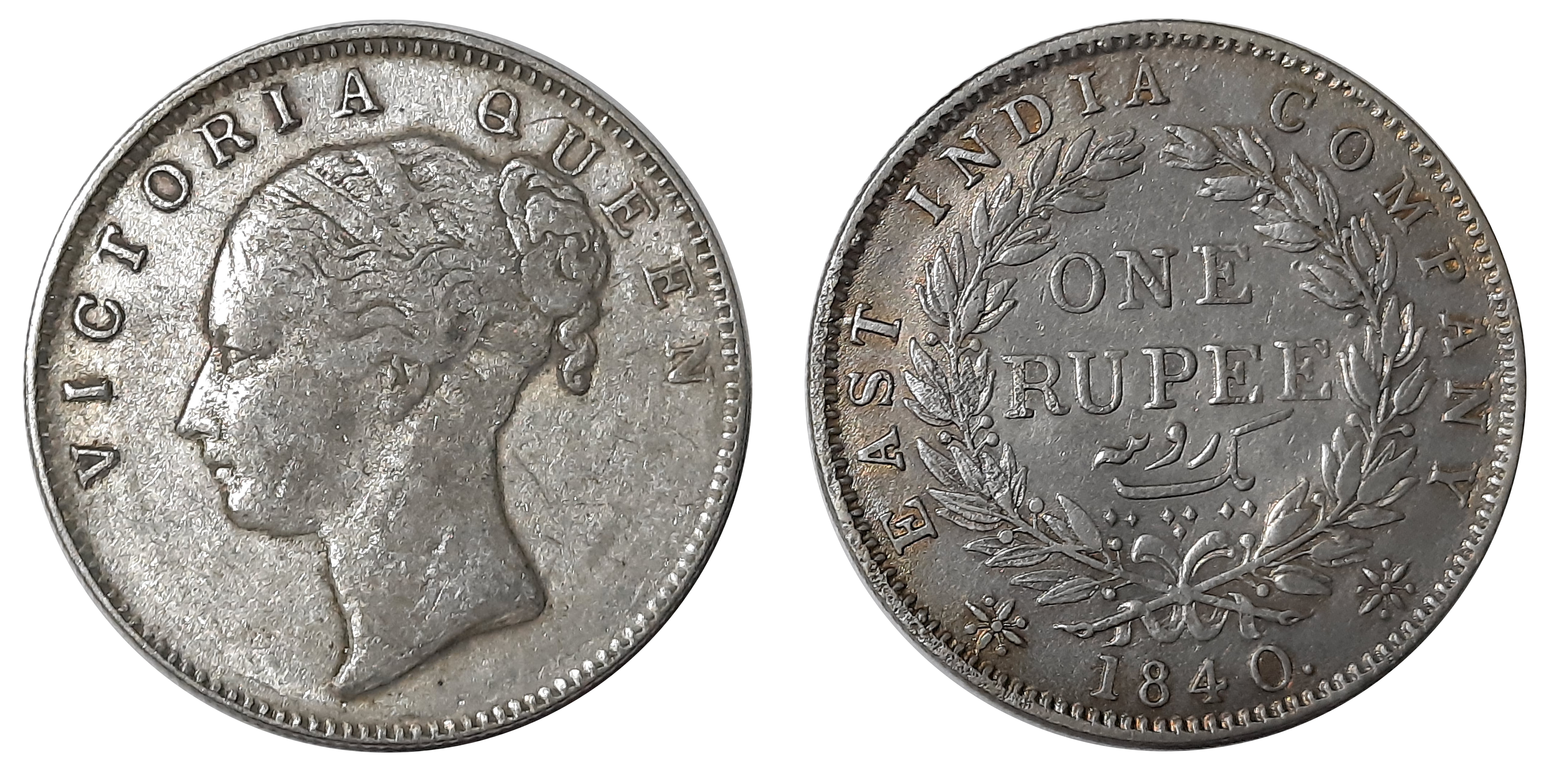 Victoria Queen, Silver Rupee, 1840, Divided Legend, Obv: Bust of Victoria Queen facing left Divided Legend “VICTORIA QUEEN” above, Rev: Value “ONE RUPEE” with in wreath date 1840 below. Legend “EAST INDIA COMPANY” above, Very fine.