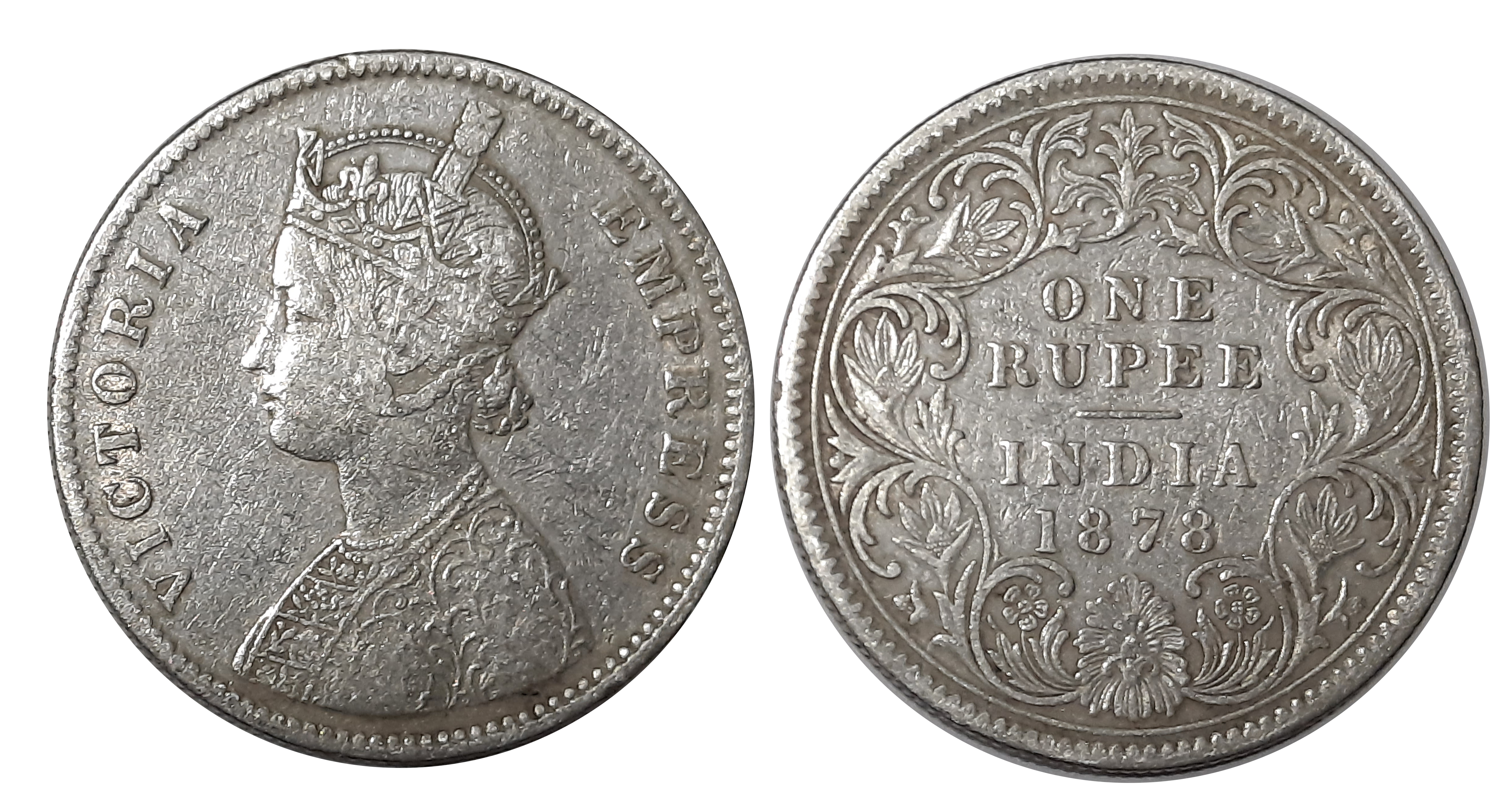 Victoria Queen, Silver Rupee, 1840, Divided Legend, Obv: Bust of Victoria Queen facing left Divided Legend “VICTORIA QUEEN” above, Rev: Value “ONE RUPEE” with in wreath date 1840 below. Legend “EAST INDIA COMPANY” above, Very fine.