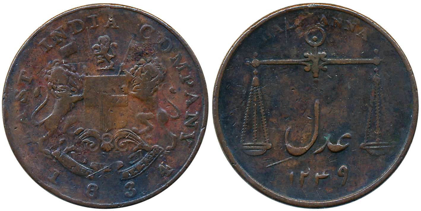 Bombay Presidency, Copper Pice, 10.30g, AD 1815, Obv: U.E.I.C. in bale mark, Rev: Scales & Adl in Persian (KM# 198). Very Fine.