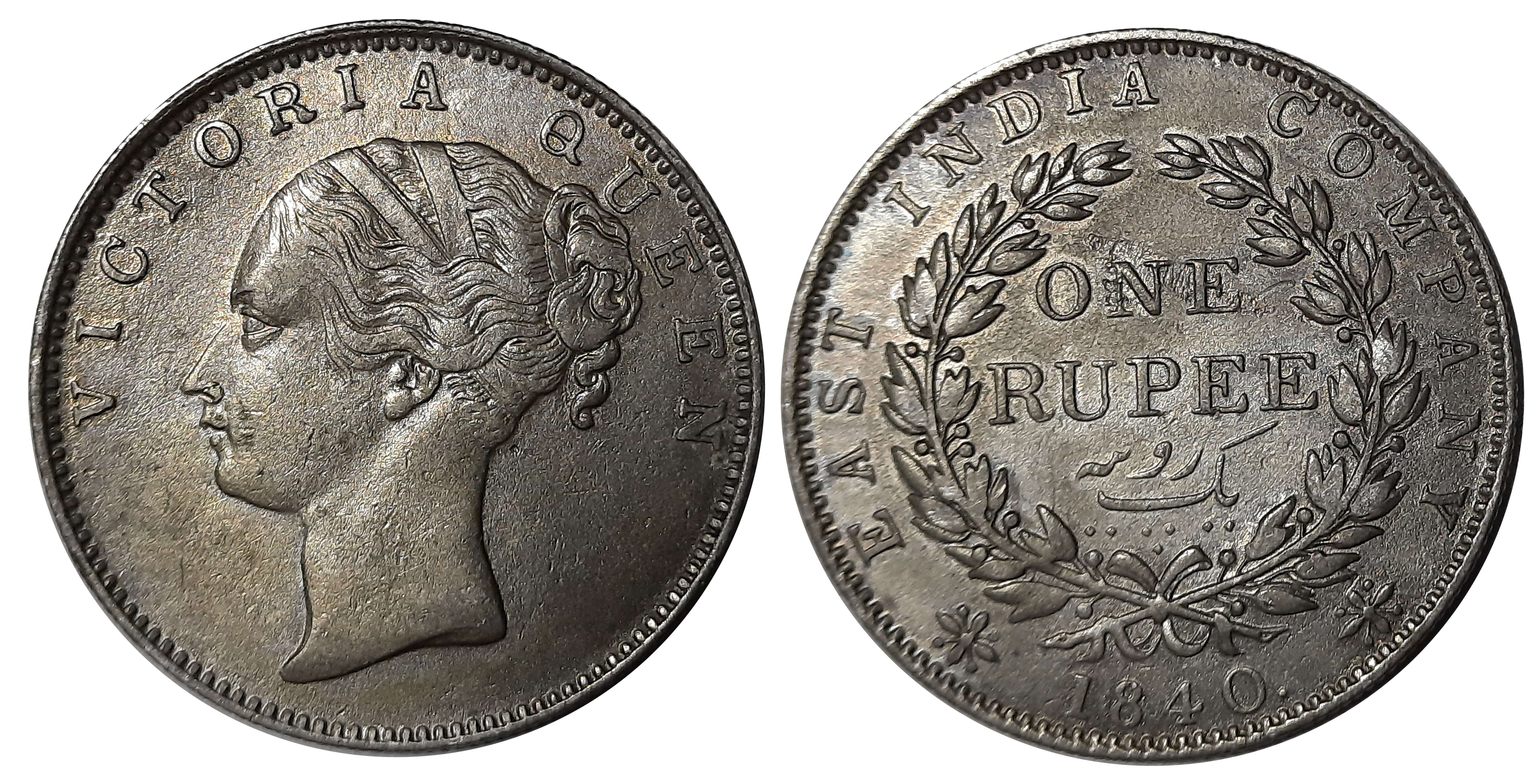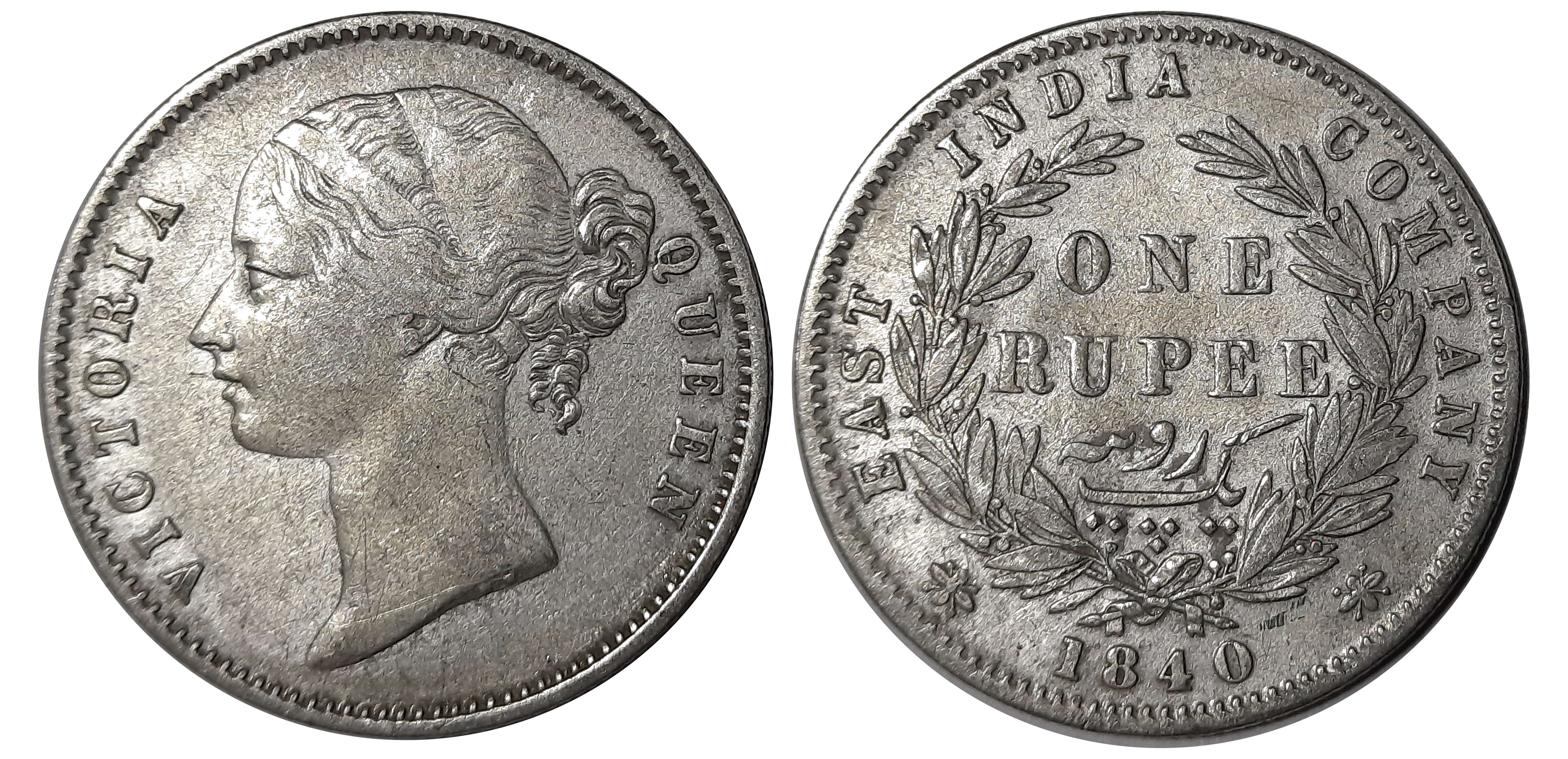 Victoria Queen, Uniform Currency, Victoria Queen, Silver Rupee, 1840, Continuous legend. About Uncirculated.