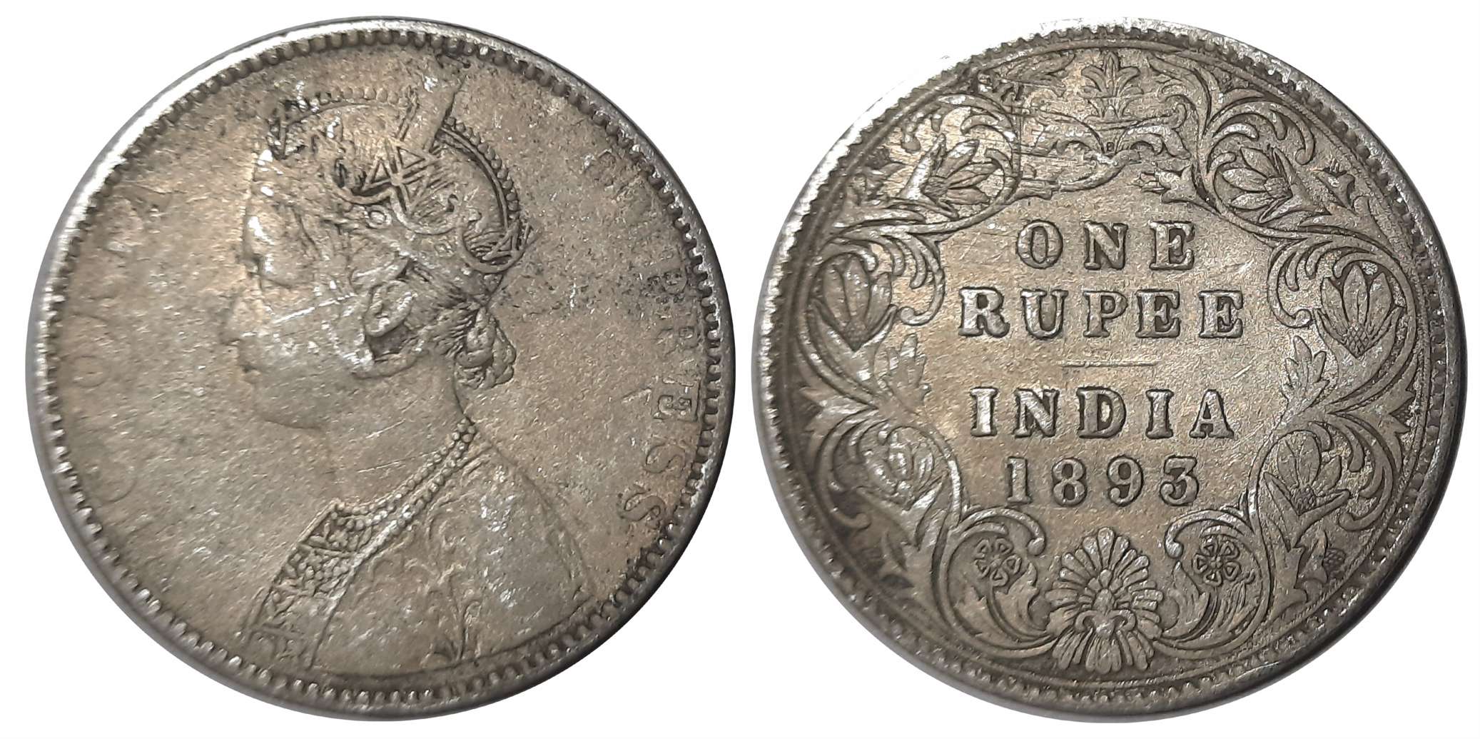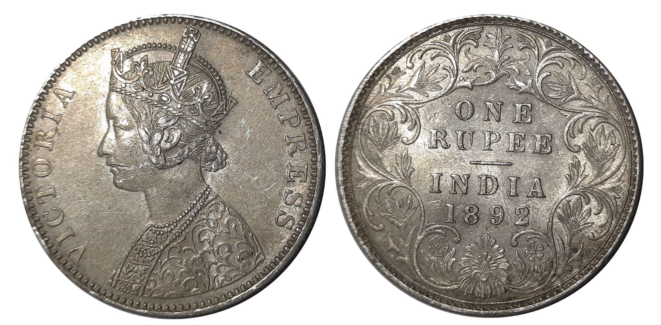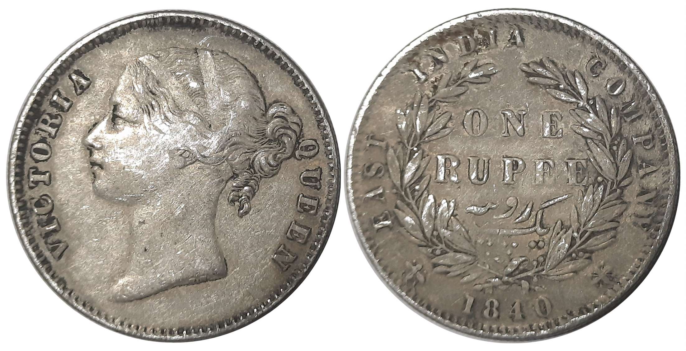 Victoria Queen, Silver Rupee, Divided Legend, Obv: Bust of Victoria Queen facing left Divided Legend “VICTORIA QUEEN” above, Rev: Value “ONE RUPEE” with in wreath date 1840 below. Legend “EAST INDIA COMPANY” above, Very fine.