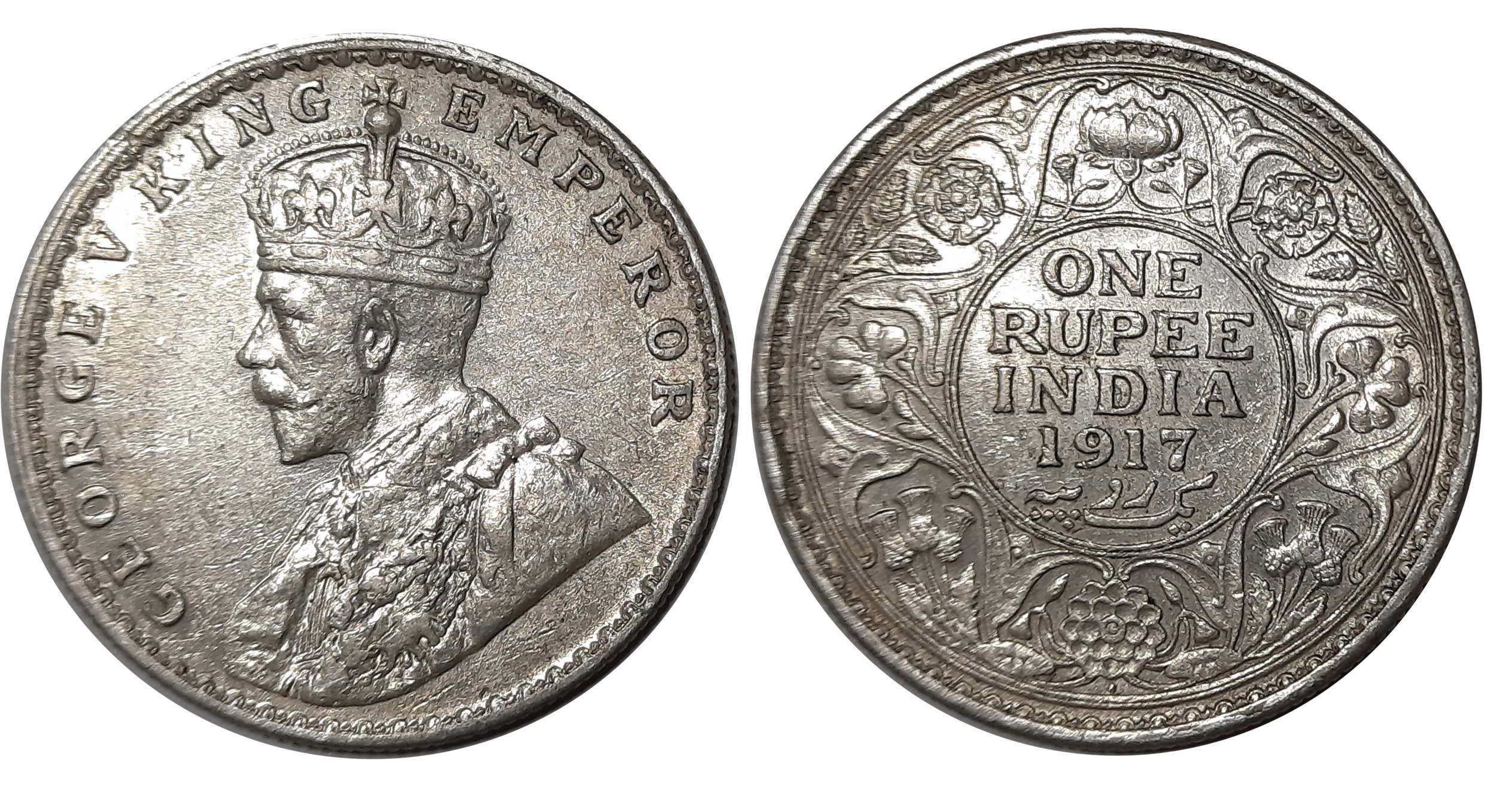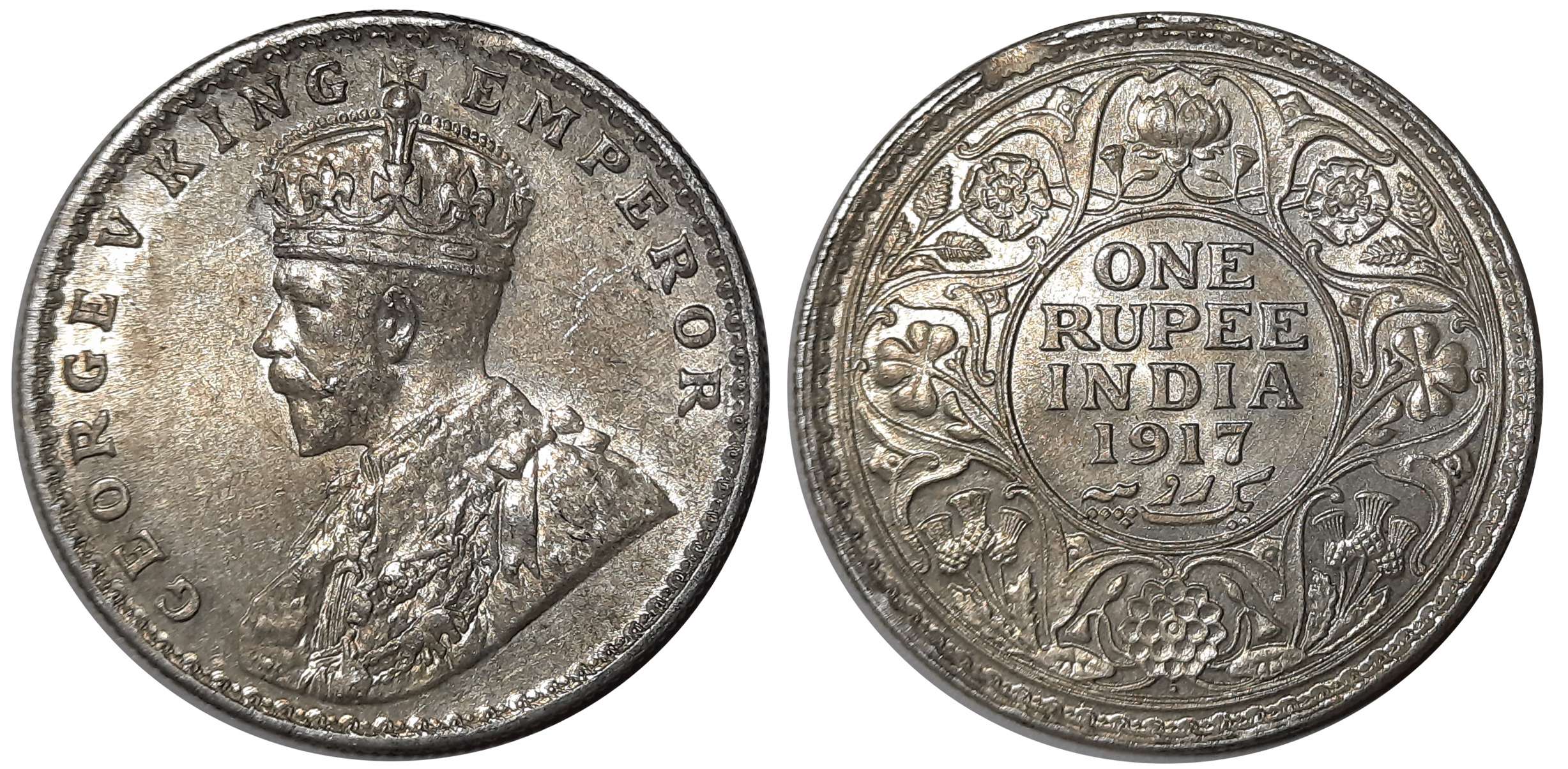 George V, Silver Rupee, 1917, Obv: King George V facing to left, Rev: Denomination & Date within circle, wreath surrounds, Very fine. Certified, Authenticated and packed in Temper Proof Coin Card.