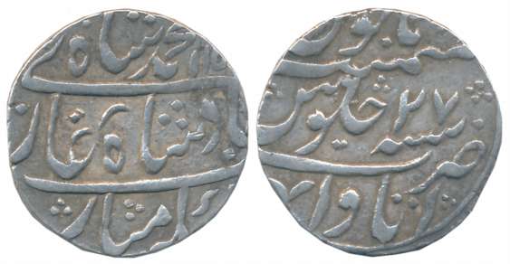 Muhiabad- Poona, Silver Rupee, 11.32g, in the name of Shah Ali Gauhar (Shah Alam II), RY 6, Parsu- Battle Axe as a mint mark (M&W# T5). Very fine.